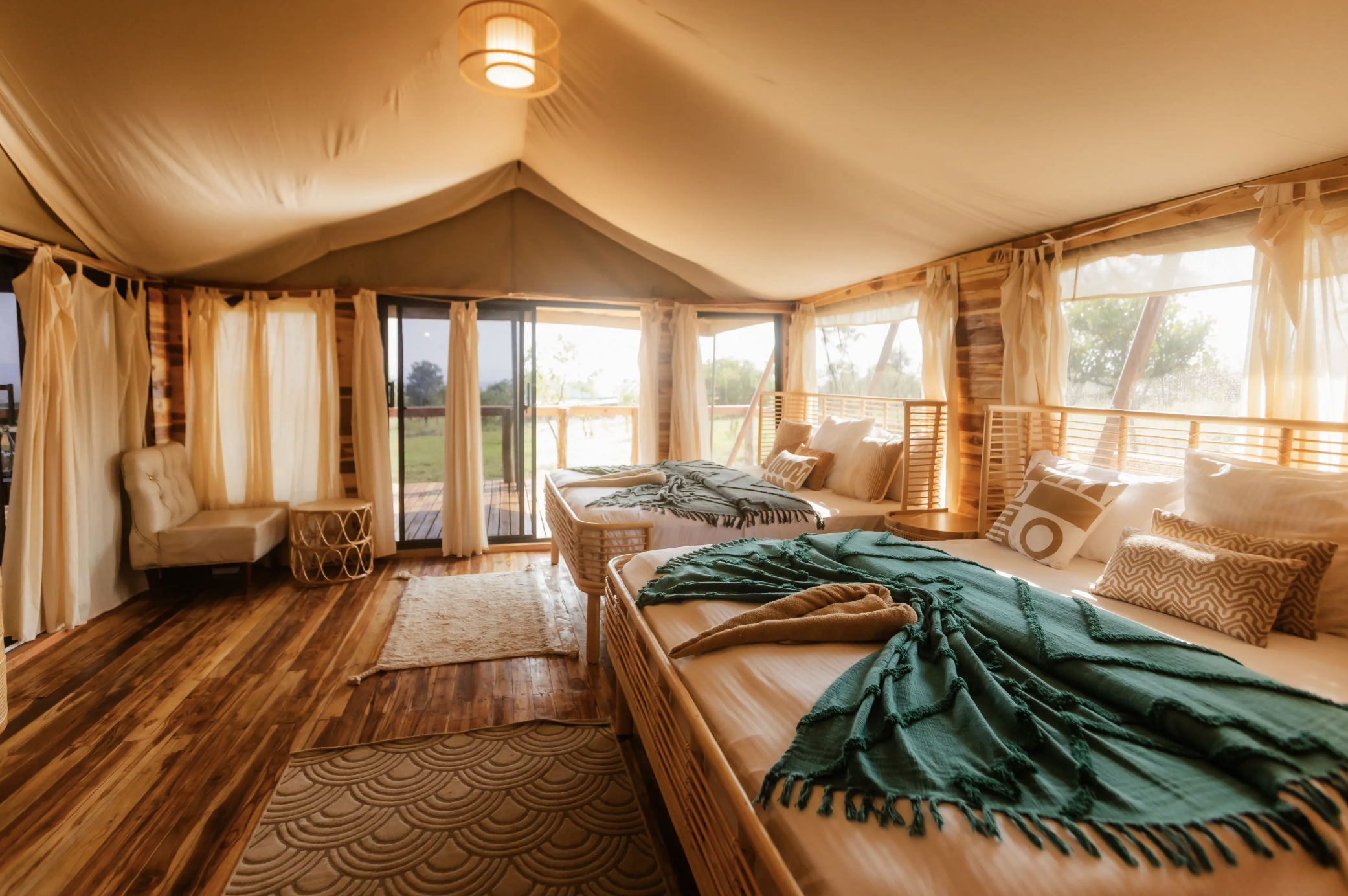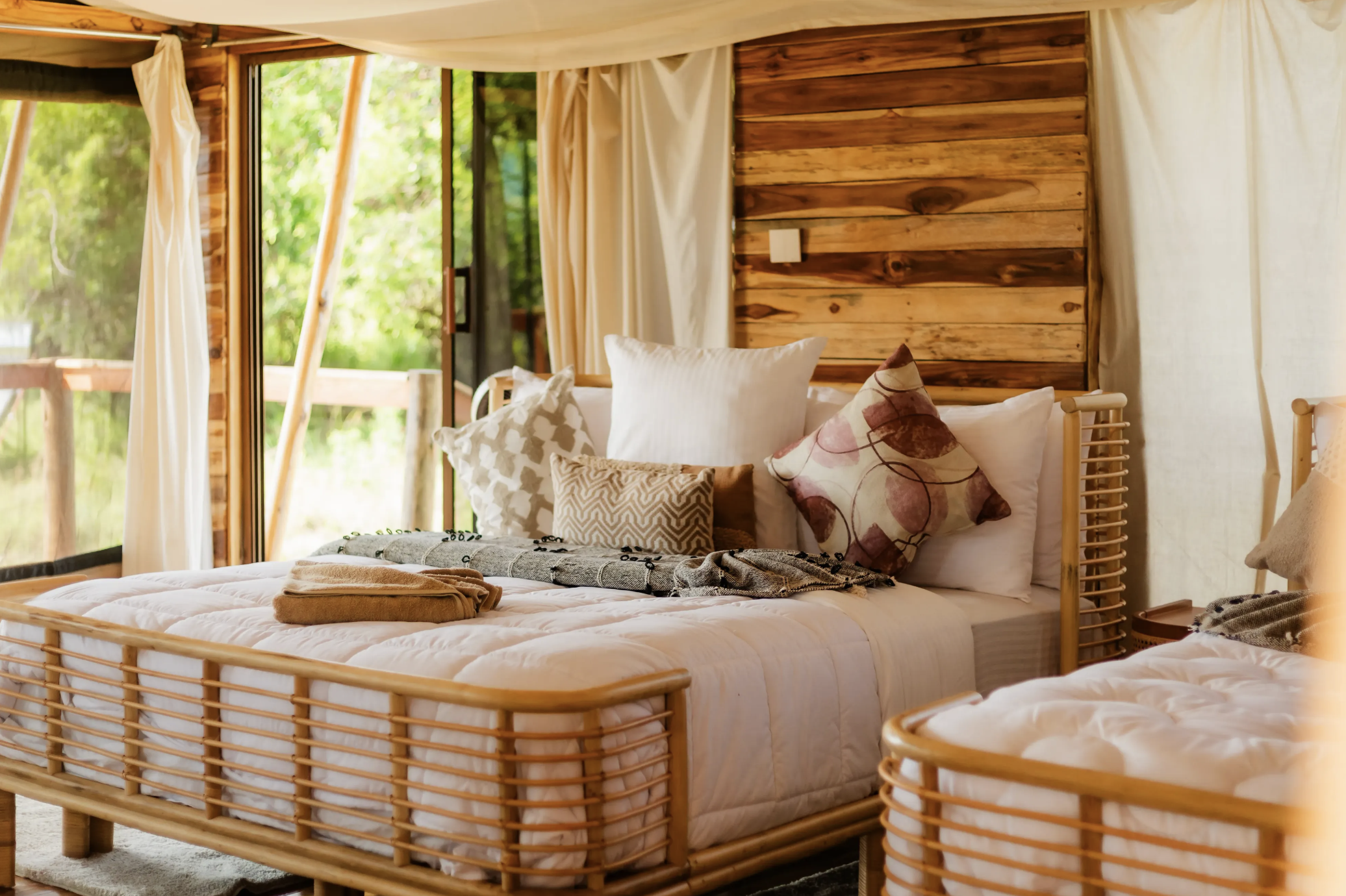 Enkutoto Migration Camp dispose de dix tentes en toile, toutes équipées de salles de bains privatives, de toilettes à chasse d'eau et d'autres équipements essentiels. Il y a un camp de tentes séparé pour la salle à manger et à côté se trouve le salon et le bar. Tout cela est accessible en quelques marches sous un auvent d'acacias en flèche, à l'avant du camp.